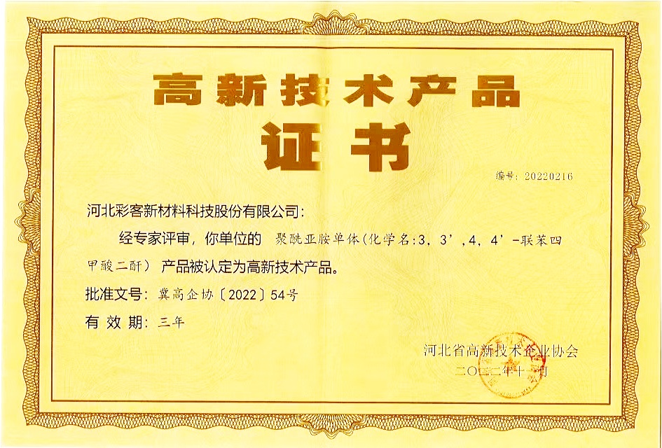 BPDA主要用于特種材料聚酰亞胺的生產,聚酰亞胺具有突出的耐溫性能和優異的機械性能,是目前已知耐熱性能最好的可實際大規模使用的聚合物材料,廣泛應用于航空航天、電氣絕緣、柔性顯示、新能源、微電子等新興領域。